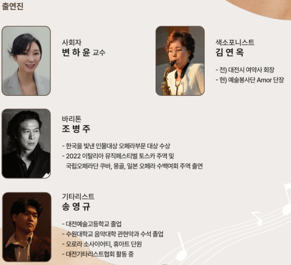 특히, 이번 축제에는 사회자 변하윤 교수를 비롯해 색소포니스트 김연옥, 바리톤 조병주, 기타리스트 송영규 등 실력파 출연진들이 참여해 공연의 수준을 높인다. 바리톤 조병주는 한국을 빛낸 인물 대상 오페라 부문 대상 수상 등 화려한 경력을 자랑하며, 기타리스트 송영규는 대전예술고등학교 및 수원대학교 음악대학을 수석 졸업한 재원이다.