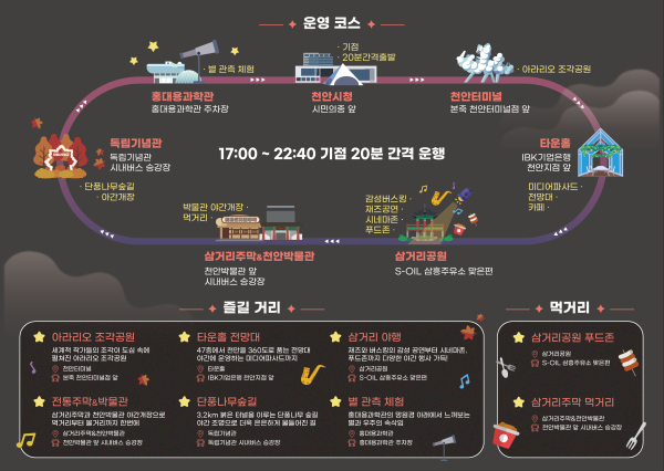 운영코스는 천안시청 시민의 종을 출발해 ▲종합터미널(아라리오조각광장) ▲천안타운홀 ▲삼거리공원 ▲천안박물관(삼거리주막) ▲독립기념관 ▲홍대용과학관을 경유하며, 20분 간격으로 순환 운행한다. 특히, 올해는 삼거리공원 등 야간관광지 주요거점에서 푸드·공연·체험 ·관람존 등을 구성·운영한다.