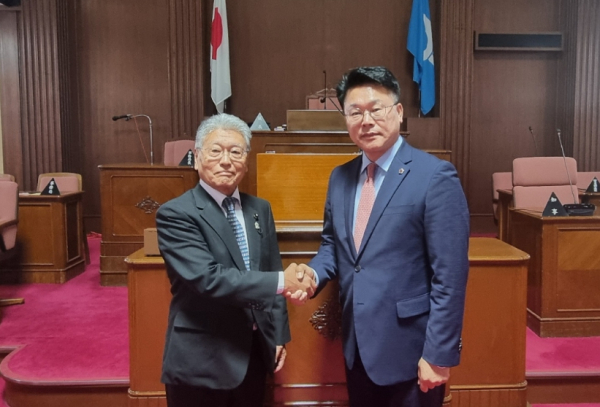 시가현의회를 방문하여 ‘가토 세이치’ 부의장을 만나고 있는 노금식 의장(우)