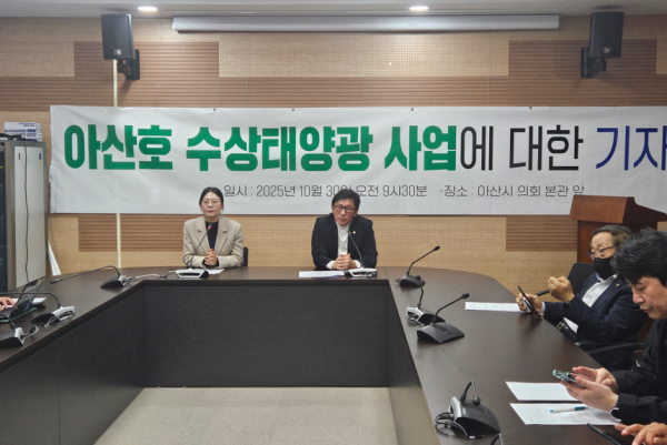 [충청뉴스 유규상 기자] 아산시의회는 30일 윤원준, 김미성, 김미영, 김은복, 김희영, 안정근, 이춘호 의원이 참여한 가운데 시 의회에서 아산호 수상태양광 사업에 대한 기자회견을 갖고 "한국농어촌공사가 주민, 아산시, 아산시의회와 사전협의도 없이 500Mw급 아산호 수상태양광사업 추진하고 있다"며, 3자 사업자 공모 중단을 요구했다.