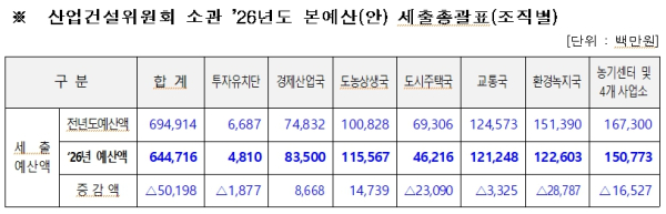 반면, 2026년도 본예산안은 2025년도 6,949억 1천4백만 원 대비 501억 9천8백만 원이 감액된 6천447억 1천6백만 원 규모로 편성 제출되어 예산 규모 변동에 대한 면밀한 검토가 필요할 것으로 보인다.