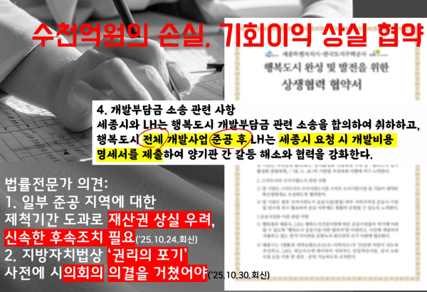가장 대표적인 사례로 LH와 체결한 '개발부담금 유예 협약'을 들며, "수천억 원 규모의 잠재적 세입을 미루는 중대한 사안을 의회 보고 없이 진행했다"며 이는 지방자치법 제47조에서 정한 '권리의 포기'에 해당할 소지가 있어 절차적 정당성이 결여됐다고 지적했다.