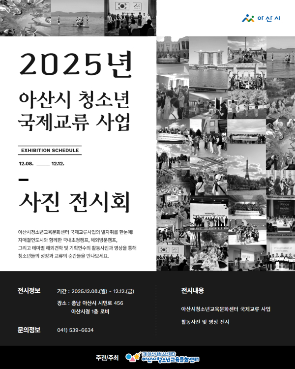 [충청뉴스 유규상 기자] 아산시청소년재단(이사장 오세현) 산하 아산시청소년교육문화센터(관장 배정수)는 오는 12월 8일부터 12일까지 아산시청 1층에서 ‘2025년 국제교류 사업 사진 전시회’를 개최한다.
