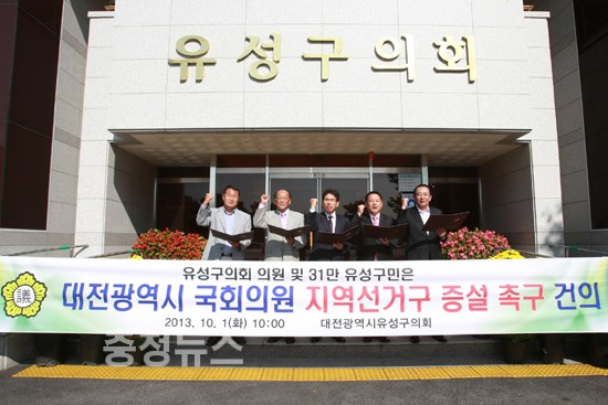 대전시 유성구의회(의장 노승연) 설장수의원(행정자치위원장)외 4인의 의원은 1일 오전 의회 본관앞에서 대전시 국회의원 지역선거구 증설 촉구를 결의했다.