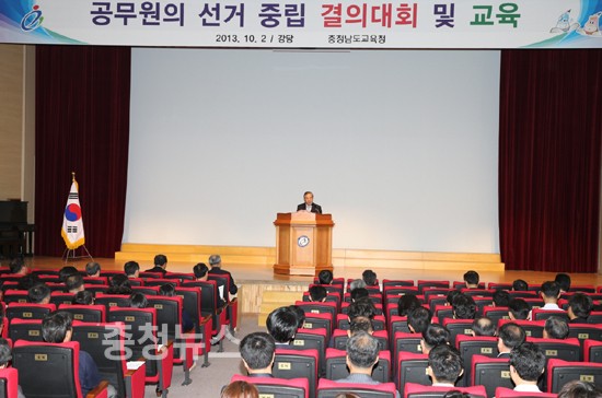 충남도교육청(교육감권한대행 부교육감 전찬환)은 2일 도교육청 대강당에서 전직원이 참여한 가운데 공직자 선거중립 자정결의대회와 선거법 관련 특별 교육을 실시했다.