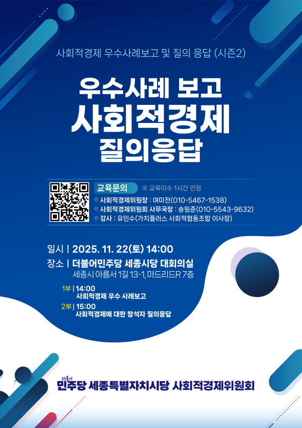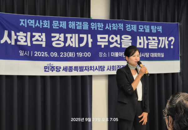 여미전 사회적경제위원회 위원장(세종시의원)은 "사회적경제는 지역의 일자리, 복지, 돌봄을 동시에 강화할 수 있는 매우 중요한 정책 수단"이라고 강조하며, "이번 강의를 통해 당원들이 현장 감각을 높이고, 이를 바탕으로 지역사회에서 사회적경제 실천이 더욱 확산되기를 기대한다"고 밝혔다.