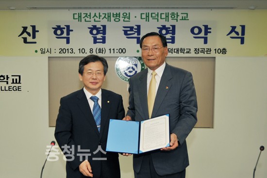대덕대학교(총장 홍성표)는 대전산재병원(병원장 이규성)과의 의료정보 관련 전문인력의 진출협력과 전문직업인 육성을 위한 상호협력을 약속하고자 8일 오전 대덕대학교 정곡관 10층 대회의실에서 협약식을 체결했다.