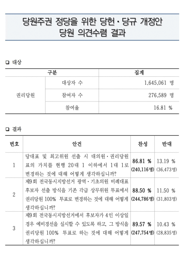 권리당원 권한 강화를 골자로 한 당헌·당규 개정안 당원 의견수렴 결과, 모든 항목에 90% 육박하는 찬성률을 보인 것.