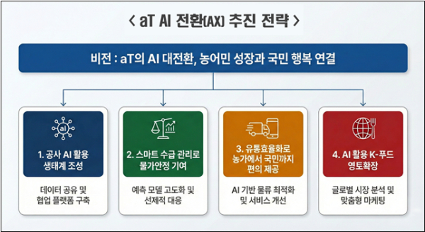 이번 AI 전환(AX) 추진 4대 전략은 ▲ 공사 AI 활용 생태계 조성 ▲ 스마트 수급관리로 물가안정 기여 ▲ 유통효율화로 농가에서 국민까지 편의 제공 ▲ AI활용 K-FOOD 영토 확장으로, 공사 대내외에서 AI를 활용한 효율성 증대로 농어민 성장과 국민 행복을 연결하는 것을 비전으로 한다.