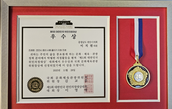 [충청뉴스 유규상 기자] 천안시의회 이지원 의원(국민의힘, 성거읍·부성1동)이 대표발의한 「천안시 종이 사용 줄이기 지원 조례」가 혁신성과 공익성을 인정받아 28일 국회 도서관에서 열린 ‘제5회 대한민국 위민의정대상’ 우수상 수상과 함께 국회 문화체육관광위원장상에도 선정되는 성과를 거뒀다.