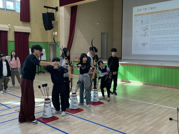 체험 프로그램은 ▲양궁부 소개 및 양궁이 어떤 운동인지 이해하는 기초 이론 교육 ▲양궁의 장점과 경기 규칙 안내 ▲기본 자세 익히기 ▲연습용 활을 활용한 실습 체험 등으로 구성됐다.