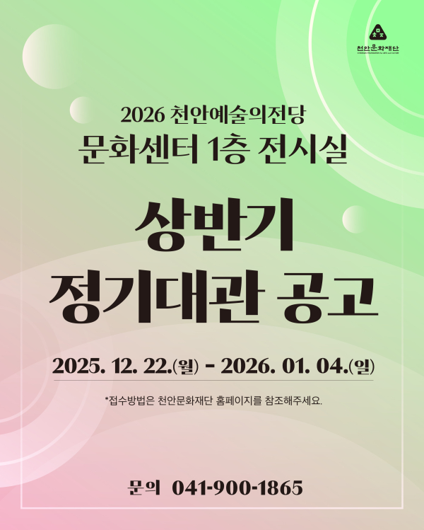 [충청뉴스 유규상 기자] (재)천안문화재단은 오는 22일부터 천안예술의전당 문화센터 전시실 내년 상반기 정기대관을 공모한다.