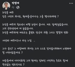 박 의원은 이날 자신의 SNS에 올린 글을 통해 “조진웅 배우 잊은 기억의 과거로, 현재를살아가는 그를 평가하려면”이라며 “조진웅 배우의 청소년기 비행 논란이 큽니다. 저도 깜짝놀랐다”고 운을 뗐다.