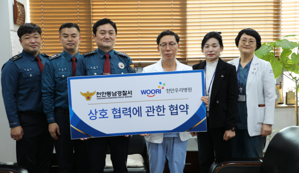 [충청뉴스 유규상 기자] 천안 동남경찰서(서장 송해영)는 9일 천안우리병원에서 김동근 병원장(천안우리병원)과 경찰공무원 및 그 가족의 의료복지 증진을 위한 업무협약(MOU)을 체결했다.