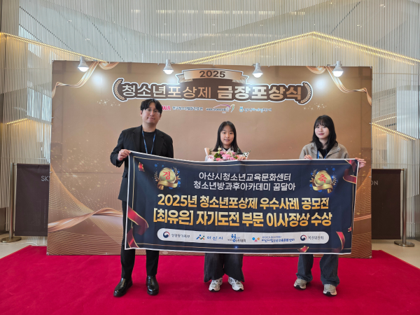 [충청뉴스 유규상 기자] (재)아산시청소년재단 산하 아산시청소년교육문화센터(관장 배정수) 청소년방과후아카데미 ‘꿈달아’ 소속 최유은 청소년이 ‘2025년 청소년포상제 우수사례 공모전’에서 우수상을 수상했다.