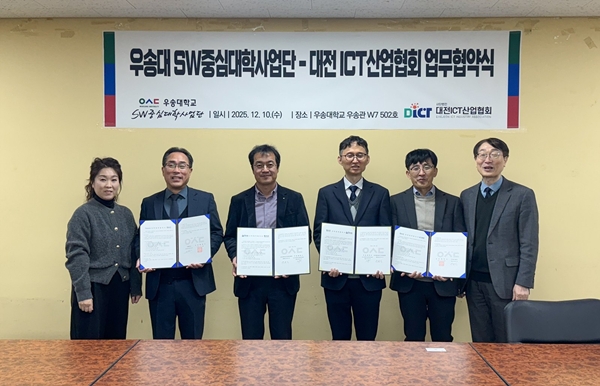 [충청뉴스 이성현 기자] 우송대학교는 최근 SW중심대학사업단이 (사)대전ICT산업협회와 ‘AI 인재 양성과 지역 ICT 기업 취업 기회 확대’를 위한 산학협력 업무협약을 체결했다고 밝혔다.