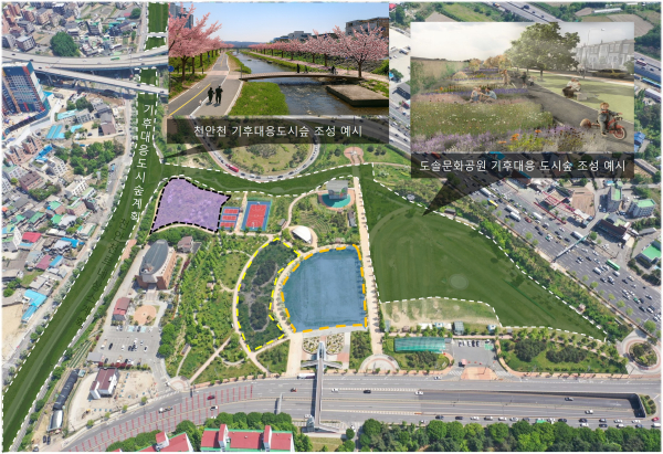 기후대응도시숲 조성사업은 산림청 주관 국비지원 공모사업으로, 30억원을 들여 도솔문화공원 잔디광장과 천안천 일대에 도시숲을 조성해 쾌적한 공원녹지서비스를 제공한다.