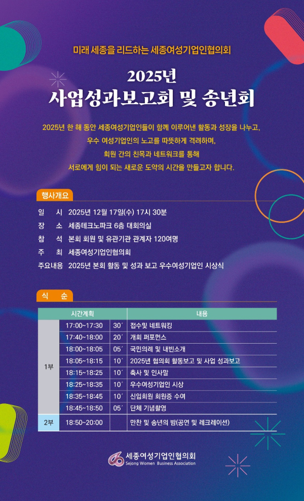 이연재 회장은 "2025년은 세종지역 여성 기업인들이 끊임없는 노력을 통해 의미 있는 성과를 창출한 한 해였다"고 평가하며, "이번 송년회는 단순한 결산을 넘어, 회원들 간의 굳건한 유대를 확인하고 다가오는 2026년을 미래 세종을 이끄는 리더로서 힘차게 준비하는 뜻깊은 자리가 될 것"이라고 기대를 표했다.
