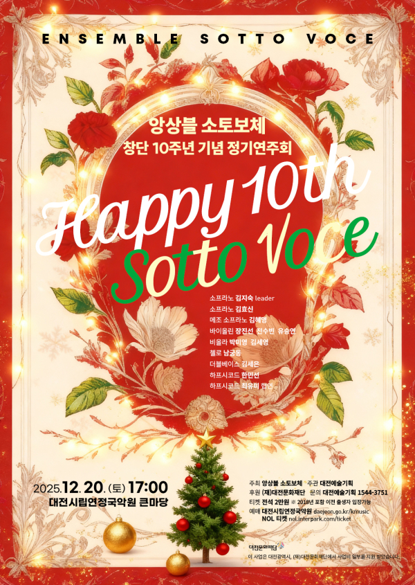 한편 이번 앙상블 소토보체 창단 10주년 기념 정기연주회 티켓은 전석 2만원이며 만 18세 미만 무료다. 예매는 대전시립연정국악원, 인터파크 NOL에서 하면 된다. 대전예술기획이 주관, (재)대전문화재단이 후원한다.