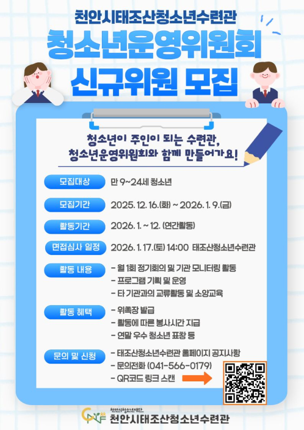 [충청뉴스 유규상 기자] (재)천안시청소년재단 천안시태조산청소년수련관은 내년 1월 9일까지 2026년 청소년운영위원회 신규 위원을 모집한다.