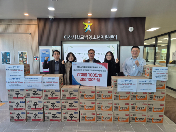 [충청뉴스 유규상 기자] 호서대학교 글로벌융합대학 미래융합스쿨과 주식회사 대영이엔씨(대표 노대영)는 장학금 100만원과 라면 35박스를 아산시학교밖청소년지원센터(센터장 김미경)에 전달했다.