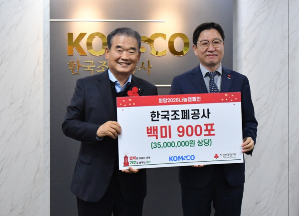 한국조폐공사는 29일 대전사회복지공동모금회(대전사랑의열매)에 쌀 900포대를 기부했다. 이번 기부된 쌀은 대전 지역 내 사회복지시설과 도움이 필요한 이웃들에게 전달되어, 취약계층의 따뜻한 겨울나기를 지원할 예정이다.