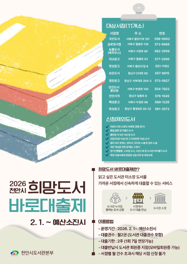 협약서점은 △국민도서 △글로벌서점 △능률도서 △대교문고 △명성문고 △보은도서 △열린문고 △천안도서불당점 △천안서적 △혜성문고 △화성문고다.