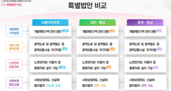 같은 당 국회의원들이 발의한 법안임에도 대전·충남 법안이 광주·전남에 비해 전혀 다른 수준의 권한과 혜택을 규정한 점, 일부 핵심 조항에선 강제력의 차이가 크다는 점 등을 문제삼았다.