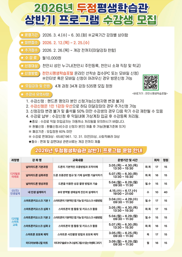 [충청뉴스 유규상 기자] 천안시 두정평생학습관은 오는 12일부터 ‘2026년 상반기 평생학습 프로그램’ 수강생 535명을 선착순 모집한다.