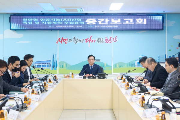 [충청뉴스 유규상 기자] 천안시가 제조업 중심의 산업 구조를 인공지능(AI) 기반으로 혁신하고, 중부권 AI 산업의 핵심 거점으로 도약하기 위한 ‘천안형 인공지능(AI) 산업 육성 및 지원계획 수립용역’ 중간보고회를 5일 시청 재난상황실에서 개최했다.