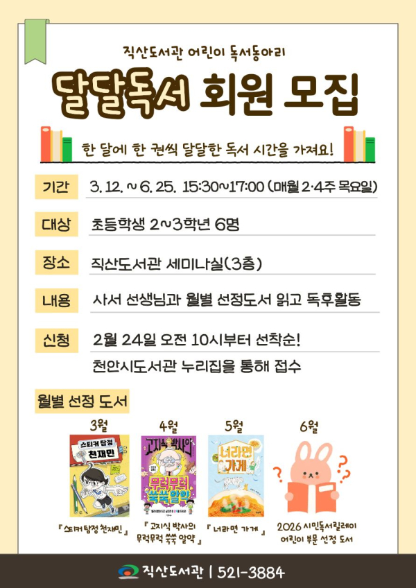 [충청뉴스 유규상 기자] 천안시 직산도서관은 상반기 어린이 독서동아리 ‘달달독서’ 참여자를 모집하며, 내달 12일부터 6월 25일까지 매주 2·4주 목요일 초등학교 2~3학년을 대상으로 운영된다.