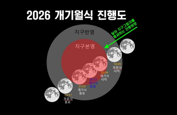 개기월식은 달이 공전하며 지구 그림자로 들어가 달 전체가 가려지는 현상으로, 지구 대기의 빛의 산란으로 인해 달도 검붉게 변해 ‘레드문’, ‘블러드문’ 이라고도 부른다. 이번 개기월식은 정월대보름과 겹친 특별한 날로, 다음 월식은 오는 2028년에 볼 수 있다.