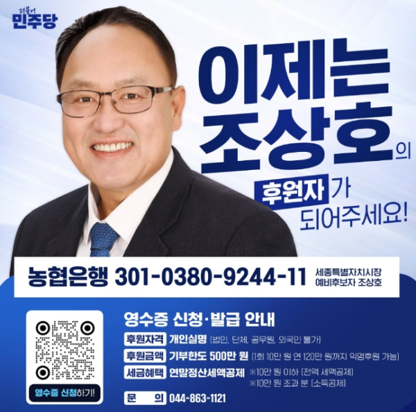 조 후보는 시민들에게 ‘후원자’를 넘어 ‘조상호의 주주’가 되어달라고 당부했다. 시민들이 투자한 정성과 관심이 4년 후 세종시의 발전과 삶의 질 향상이라는 ‘성과’로 되돌아가는, 일종의 시민 참여형 정치 실험을 제안한 것이다.