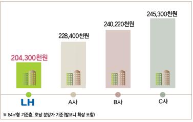 호당 평균 분양가격은 2억1백만원(3.3㎡당 593만원)이고, 층과 주택형에 따라 최저 1억79백만원(3.3㎡당 529만원)에서 최고 2억4백만원(3.3㎡당 605만원)까지 가격을 차등해서 공급한다.