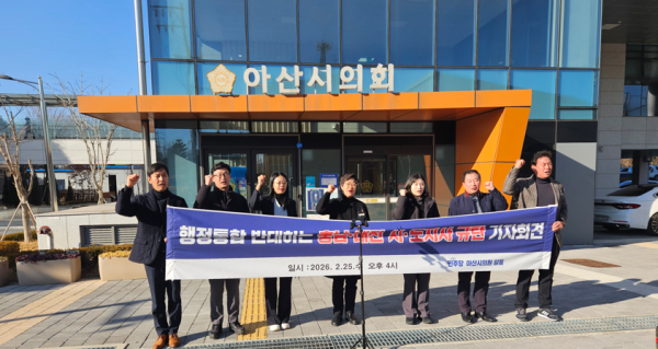 더불어 민주당 소속 아산시의원(김희영, 명노봉, 김미성, 안정근, 김미영, 천철호, 이춘호)들은 오늘 아산시의회 정문 앞에서 "어제 국회 법제사법위원회에서 행정통합 특별법 처리가 되지 못했다. 이는 단순히 법안 하나가 멈춘 것이 아니라 수도권 일극체제에 맞서 충남과 대전이 생존할 수 있는 유일한 탈출구를 국민의힘 스스로 봉쇄한 것이며, 충남의 경제 중심지인 우리 아산시의 미래 성장 동력마저 짓밟은 명백한 배신행위"라고 비난 했다.
