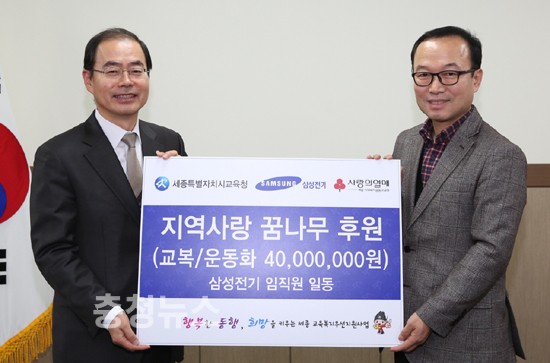 세종특별자치시교육청(교육감권한대행 부교육감 전우홍)은 지난 5일(목) 오후 4시 삼성전기 세종사업장(세종지원그룹장 고충환)로부터 소외계층 학생을 위한 4,000만원 상당의 후원물품(교복 및 운동화)을 기증받았다고 밝혔다.