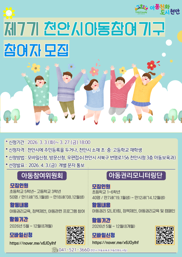 모집 대상은 천안시에 주소를 두거나 지역 내 학교에 재학 중인 아동으로, 아동권리 홍보와 정책 참여 활동에 관심이 있다면 누구나 지원할 수 있으며, 모집 인원은 아동참여위원회 50명, 아동권리모니터링단 40명 등 총 90명 규모다.