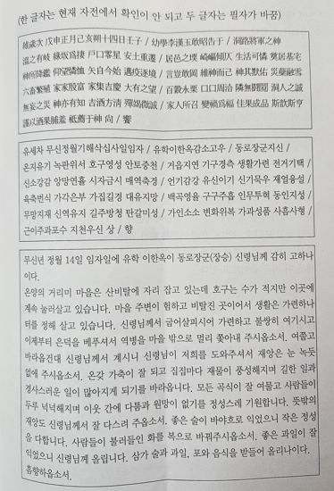 제사가 종료되면 제물을 음복하고 모닥불을 피우며 풍장도 치면서 마을의 평온과 무병장수와 화합을 기원하였다. 마을에서는 1968년도에 만든 오래된 축문을 참고로 하여 당시 상황에 맞게 변형하여 매년 축문을 새로 작성하여 사용하고 있다. 본 기자가 당시의 축문을 찾으려는 노력에도 불구하고 원본은 구하지 못해 아쉬움으로 남지만 2020년도 온양문화원에서 발간한 아산의 동제 1편 43쪽에 기록된 내용을 구해서 여기에 편집하게 된 것은 그나마 다행이다.