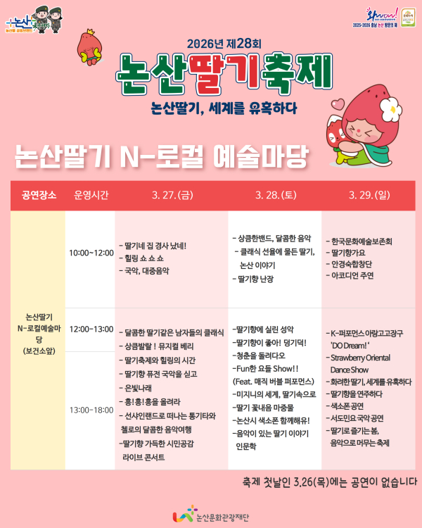 올해 28회를 맞는 논산딸기축제는 달콤한 딸기의 맛과 다채로운 경험, 풍성한 볼거리가 어우러진 봄 대표 축제로 방문객들을 맞이할 준비를 마쳤다. 이번 축제가 논산딸기의 세계적인 경쟁력과 산업적 가치를 널리 알리는 무대가 될 것으로 기대를 모으고 있다.