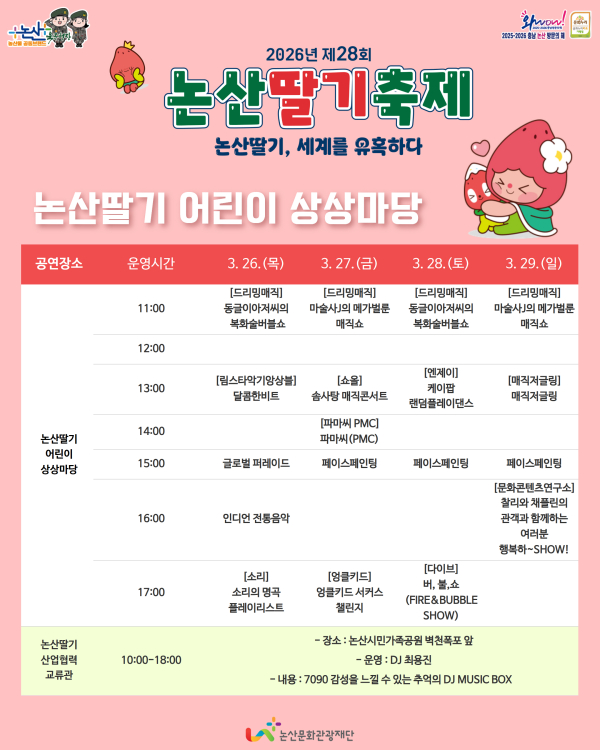 - 시민가족공원 일원에서 축제가 개최되는 만큼 아이들과 가족이 함께 어울릴 수 있는 다양한 체험과 놀이 공간이 마련된다. 자연놀이 한마당, 열차투어, 판타지 놀이랜드, 족욕체험 등 가족 단위 방문객을 위한 프로그램이 다채롭게 운영돼 특별한 추억을 선사한다. 어린이 상상극장에서는 매일 마술쇼, 페이스 페인팅 등 아이들의 눈높이에 맞춘 공연으로 축제의 즐거움을 더한다. ‘논산세계딸기산업엑스포 벽화그리기’는 엑스포의 성공을 염원하는 시민의 마음을 담은 참여형 프로그램이다. 논산딸기축제가 특히 젊은 층의 인기를 얻고 있는 만큼 트렌디한 무대도 준비됐다. 피지컬 서바이벌 ‘배틀크루’경연이 펼쳐져 2024년 강경젓갈축제 당시 뜨거운 호응을 얻었던 열기가 다시 한번 재현될 것으로 기대된다. 올해 처음 선보이는 ‘전국 드론 축구대회’ 역시 전국에서 참가자들이 모여 열띤 경쟁을 펼치며 참여형 축제의 매력을 한층 더할 전망이다.