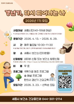 [충청뉴스 최형순 기자] 세종시보건소는 오는 23일부터 갱년기 여성의 신체·정신 건강 관리를 위한 한의약 건강증진 프로그램 ‘갱년기, 다시 피어나는 나’ 참가자를 선착순 모집한다.