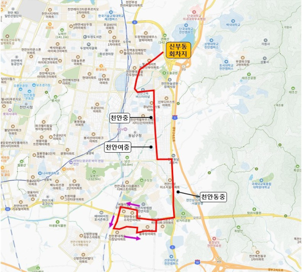청룡동 지역에 신설되는 73번 노선은 신부동 회차지를 기·종점으로 1일 4회 운행한다. 시는 등·하교 시간을 고려해 배차를 확정했으며, 천안동중·천안여중·천안중학교 등 주요 학교 인근의 천안대로와 충절로를 경유하도록 설계해 학생들의 접근성을 높였다.