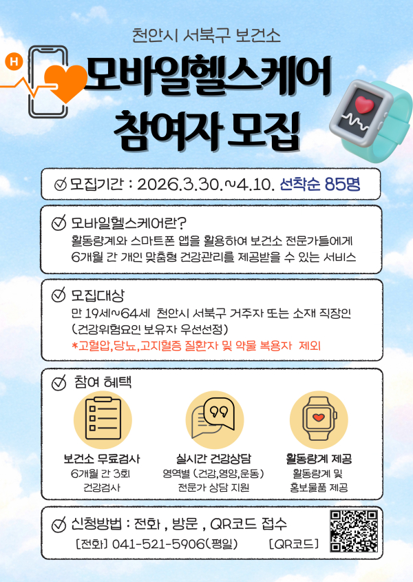 [충청뉴스 유규상 기자] 천안시 서북구보건소는 오는 30일부터 ‘모바일 헬스케어’ 사업 참여자를 모집한다.
