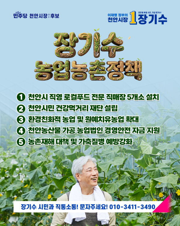 [충청뉴스 유규상 기자] 더불어민주당 장기수 천안시장 예비후보가 농업·농촌의 구조적 변화를 이끌기 위한 종합 공약을 발표하며 농민 표심 공략에 나섰다.