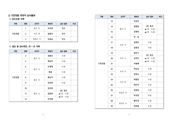 기초의원 역시 대부분 지역에서 경선 또는 순위 경쟁 방식이 적용됐다. 중구 다 선거구는 4인 경선으로 가장 높은 경쟁률을 기록했고, 서구 나 선거구 등에서도 3인 경선이 이어지며 치열한 내부 경쟁이 예고됐다.
