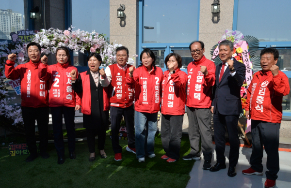 ▲조치원읍 제1선거구 윤여택, ▲전의·전동·소정면 엄현택, ▲고운동 서용숙, ▲보람동 박윤경, ▲반곡·집현동 이미경 예비후보와 ▲비례대표 송동섭 예비후보 등이 참석해 김대곤 예비후보와 함께 '원팀'으로서의 필승 의지를 다졌다.