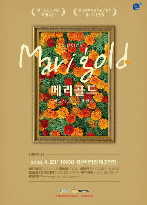 [충청뉴스 금산 = 조홍기 기자] 금산다락원은 4월 23일 오후 7시 생명의 집 대공연장에서 대학로 감성 뮤지컬 ‘메리골드’를 선보인다.