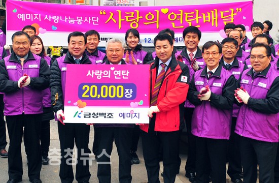 (주)금성백조주택(회장 정성욱) 예미지 사랑나눔 봉사단 30명은 26일, 대전 동구 인동에서 김형태 대전 사회복지공동모금회장에게 사랑의 연탄 20,000장을 전달했다.