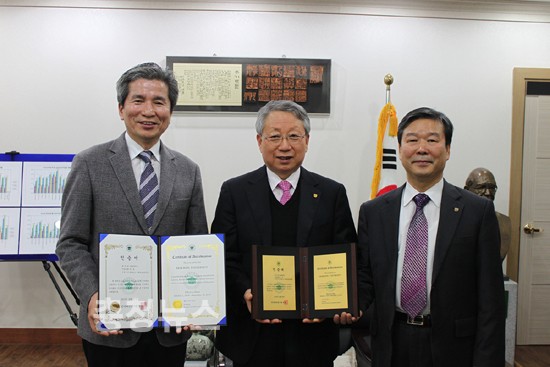 ▲ 권혁대교학부총장, 김원배총장, 김기련대외부총장