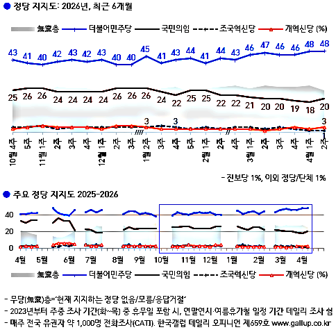 정당 지지도 조사 결과 민주당은 48%, 국민의힘은 20%, 개혁신당은 3%, 조국혁신당과 진보당은 각 1%를 기록했다. 무당층은 25%로 집계됐다.